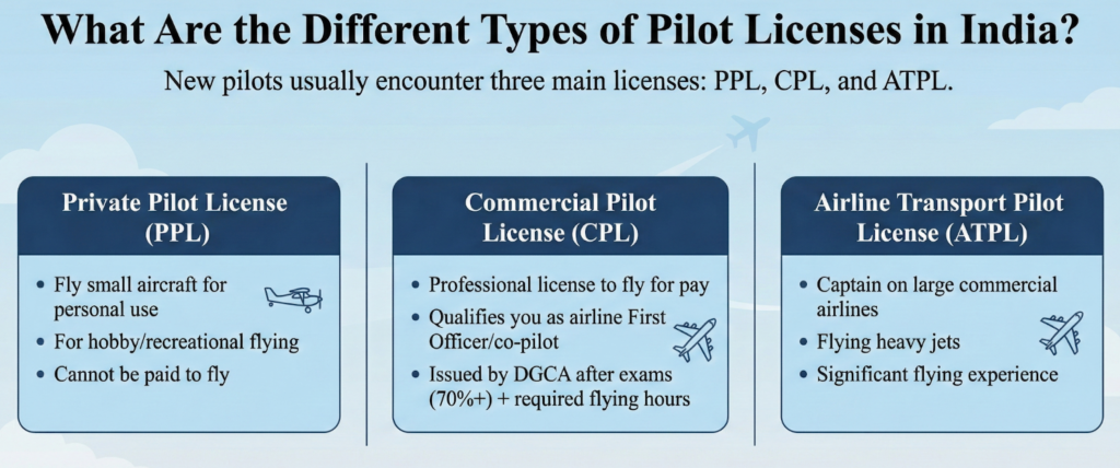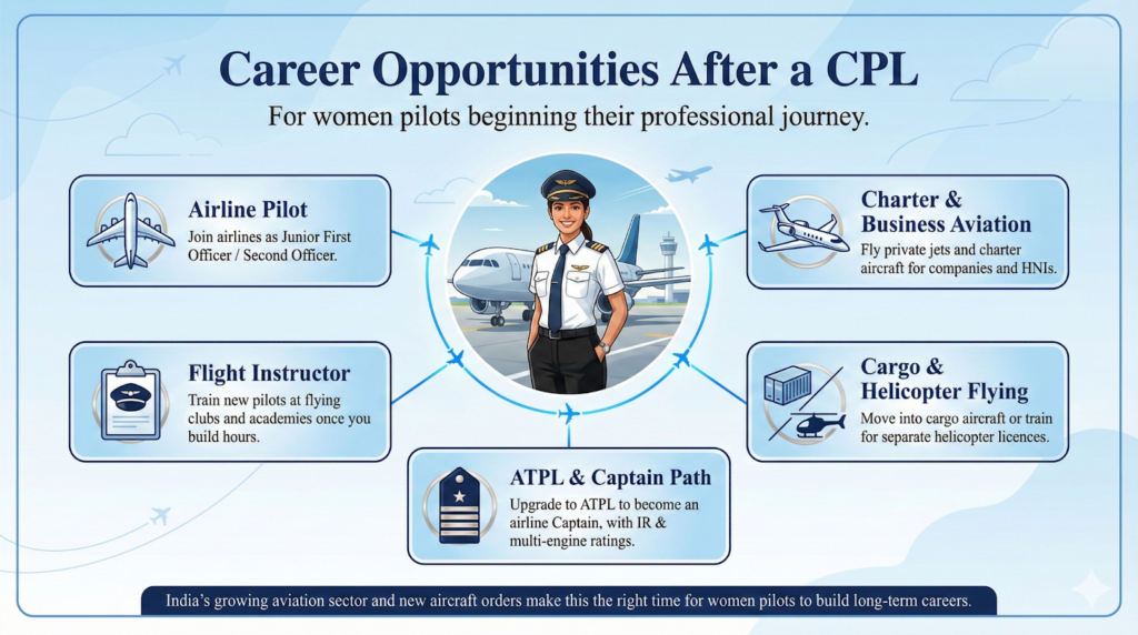 | Commercial Pilot License (CPL) | Multi-Engine Aircraft | 200 hours total | DGCA skill test, airline readiness |